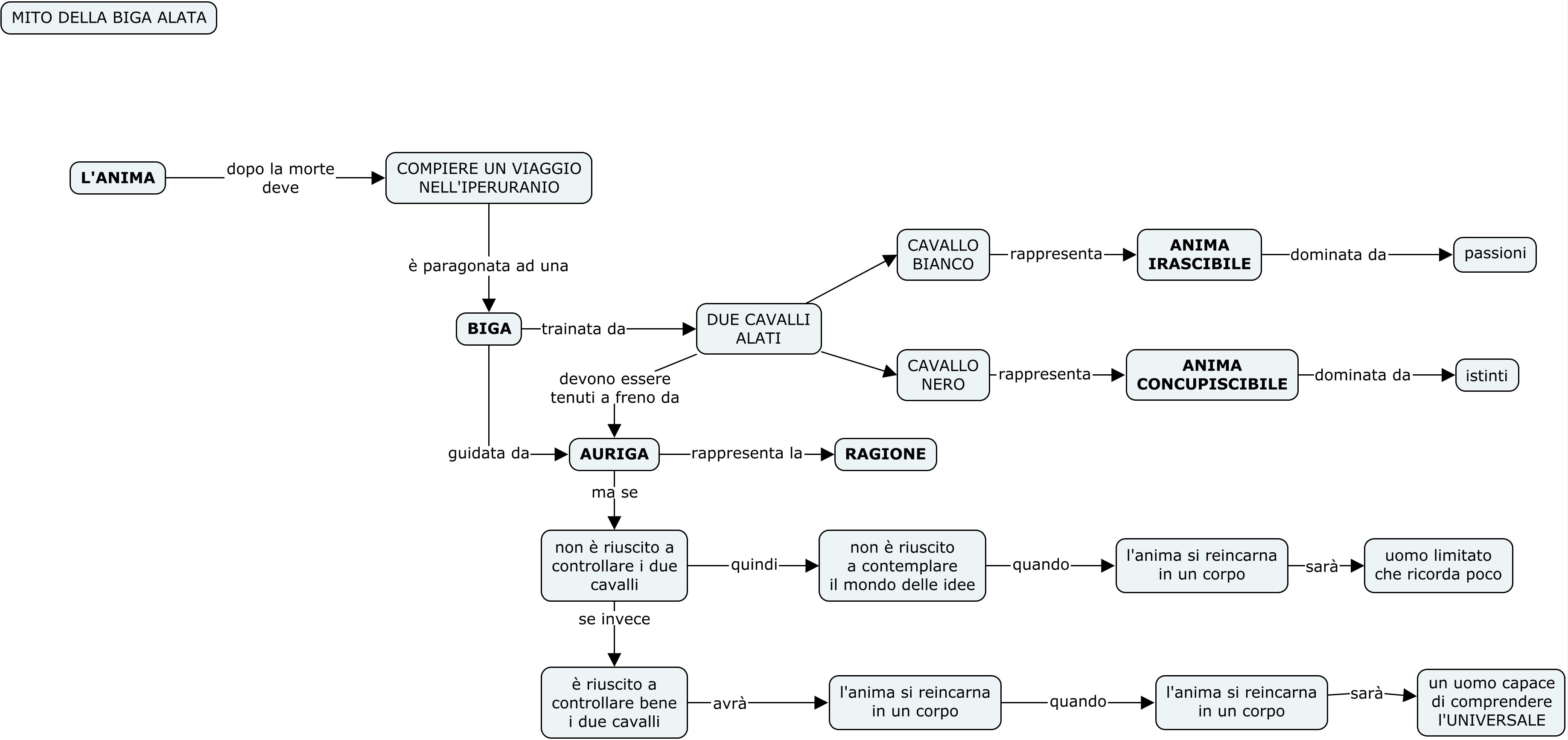Il mito dell’Iperuranio non deve essere visto come una fondazione della metempsicosi (la trasmigrazione delle anime). Platone sarebbe sinceramente ben poco significativo se avesse semplicemente sostenuto la trasmigrazione delle anime — che era già stata affermata da Pitagora, e dall’orfismo. Vediamo che cosa può significare il mito dell’Iperuranio — cioè il mito della biga alata. È noto il racconto: prima di incarnarsi in un corpo, l’anima correrebbe in un cielo (uranòs) che sta oltre il cielo (ypèr). In questo cielo Iperuranio si trovano i modelli eterni delle cose, le idee. L’anima percorrendo l’Iperuranio contempla le idee. L’anima si presenta con l’aspetto di una biga alata: un carro guidato in piedi da un auriga, che simboleggia l’anima razionale dell’uomo. A trainare la biga sono un cavallo bianco e un cavallo nero. Il cavallo nero, che è focoso , tende a portare fuori strada, a dare scossoni, a far sobbalzare la biga, e simboleggia l’anima concupiscibile, vale a dire la sfera degli istinti. L’altro cavallo, quello bianco, è un cavallo generoso, di buona razza, che però tende a correre un po’ troppo e dev’essere tenuto anch’esso a freno dall’auriga: corrisponde all’anima irascibile, cioè alle passioni.