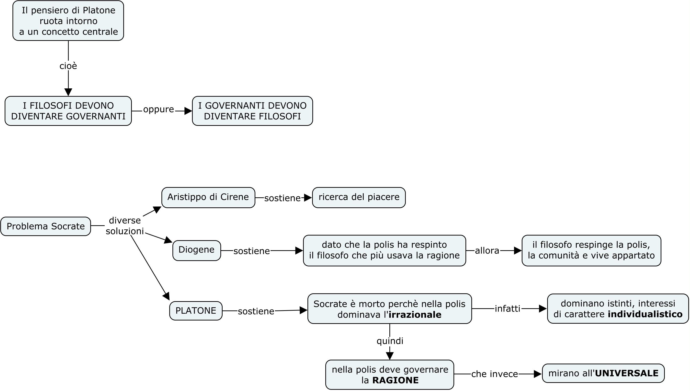 Di fronte alla soluzione individualistica dei Cirenaici, di fronte alla fuga dei Cinici, c’è la terza grande soluzione, quella di Platone: se Socrate è stato condannato a morte, ciò è avvenuto perché nella polis invece di dominare la ragione domina l’irrazionale; invece di dominare la ragione, che è universale e che mira al bene comune, dominano passioni, istinti, interessi, tendenze di carattere individualistico. La Polis dovrà essere conformata alla ragione, nella città si dovrà imporre la razionalità, e cioè l’universalità. Questo sarà possibile soltanto da parte di chi coltiva la razionalità stessa, di chi cerca la visione dell’universale, cioè dei filosofi.