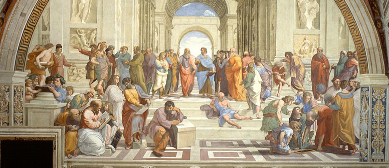 Il mondo ideale è un altro mondo, che sta al di là del mondo sensibile. In un famoso mito Platone si riferisce a questo mondo come Iperuranio. Tutto questo è stato espresso in maniera mirabile e plastica da Raffaello nel famoso affresco della Scuola di Atene nelle stanze del Vaticano, dove vengono raffigurati tutti i maggiori filosofi greci idealmente a colloquio fra loro a prescindere dalla cronologia, riuniti in un porticato; in primo piano ci sono Platone e Aristotele, Platone indica verso il cielo, Aristotele verso la terra: per Platone l’essenza delle cose, quello per cui le cose sono ciò che sono, è trascendente, sta al di fuori della loro consistenza fisica, per Aristotele è immanente, è interna ad esse.