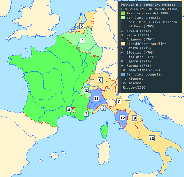 Il trattato di Campoformio costrinse l’Austria a riconoscere l’esistenza della Repubblica Cisalpina e l’annessione del Piemonte alla Francia. Napoleone conquistò gran parte dell’Italia in nome della Rivoluzione francese nel 1799.